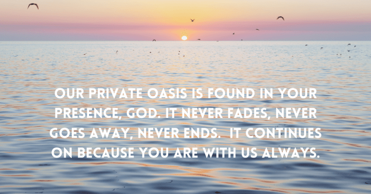 Lord, thank you for this summer. Thank you for the oasis we’ve been able to enjoy—through vacations, still moments, and simple joys. But even more, thank you that the private oasis with You never fades, never ends. It’s always there, always accessible. Thank You for being our place of peace, our refuge, our renewal.